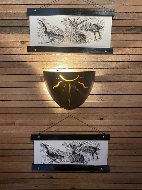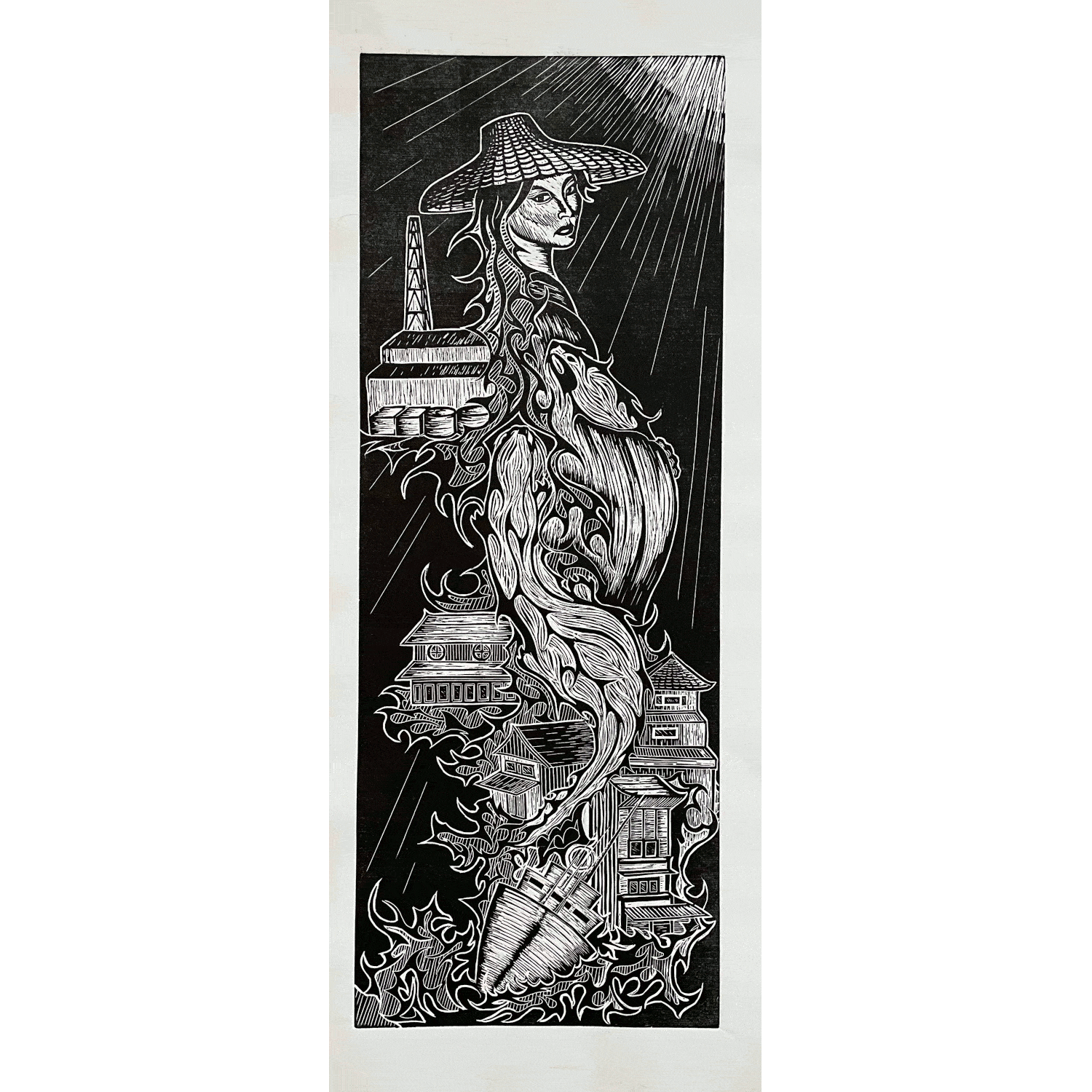 ‘Raining Devolution’ is a Western relief print on linoleum. The print is a commentary on the way we’re returning petroleum to the oceans (via plastics). Fossil fuels are literally the bones of ancient sea creatures, and there’s a irony in sprinkling the global seas with the bones of tilobites and placoderms.